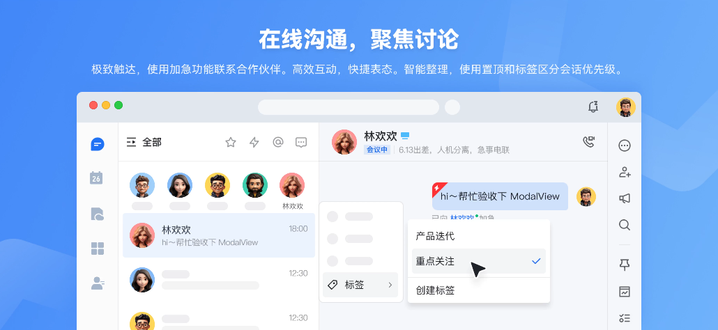 极致触达,使用加急功能联系合作伙伴。高效互动,快捷表态。智能整理,使用置顶和标签区分会话优先级。