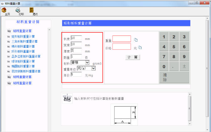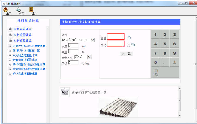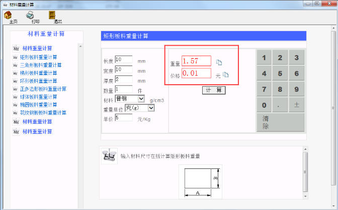 重量计算:支持钢板、圆钢、方钢、角钢、工字钢、槽钢、钢管等12类钢材的重量计算,覆盖矩形、三角形、梯形、环形等板料形状。