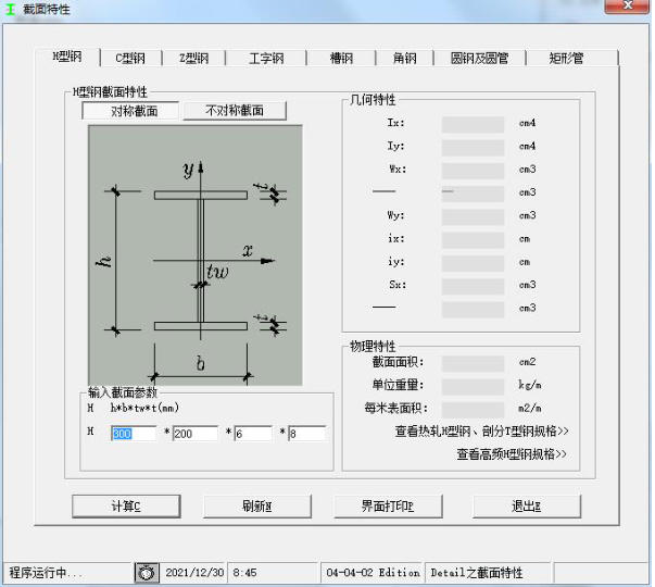 支持对称与非对称截面的h型钢计算,涵盖ix、iy(惯性矩)、wx、wy(截面模量)等核心几何参数,以及截面面积、单位重量、每米表面积等物理特性。