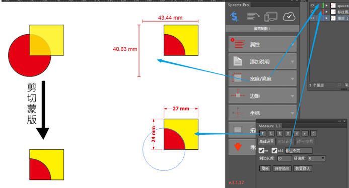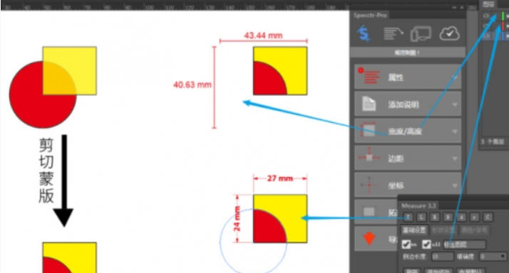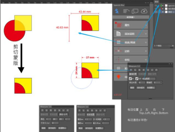 measure独有剪切蒙版标注功能,可穿透蒙版层直接标注内部元素尺寸,解决复杂设计中的标注难题。同时,支持批量选择对象并一键生成标注,大幅提升重复性工作的效率。