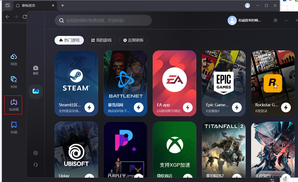 ●温馨提示:限制ip类游戏暂不支持加速;在夸克默认界面左侧栏点击进入;