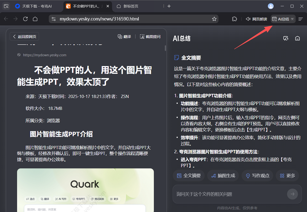 5、ai高效浏览网页:解析总结网页内容,生成摘要大纲,支持快速翻译内容、一键生成脑图,安全纯净快速,打造极致浏览体验