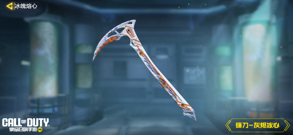 镰刀-灰烬冰心的刀刃由透明冰晶打造,闪烁着寒光,而刀身中流淌着炽热的橙色能量,冰与火元素交织,形成鲜明对比。
