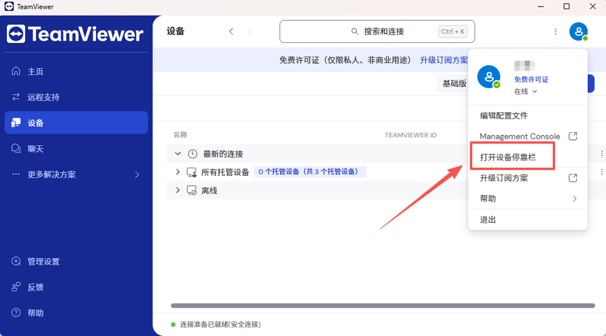 点击界面右上角的个人资料,然后点击【打开设备停靠栏】。