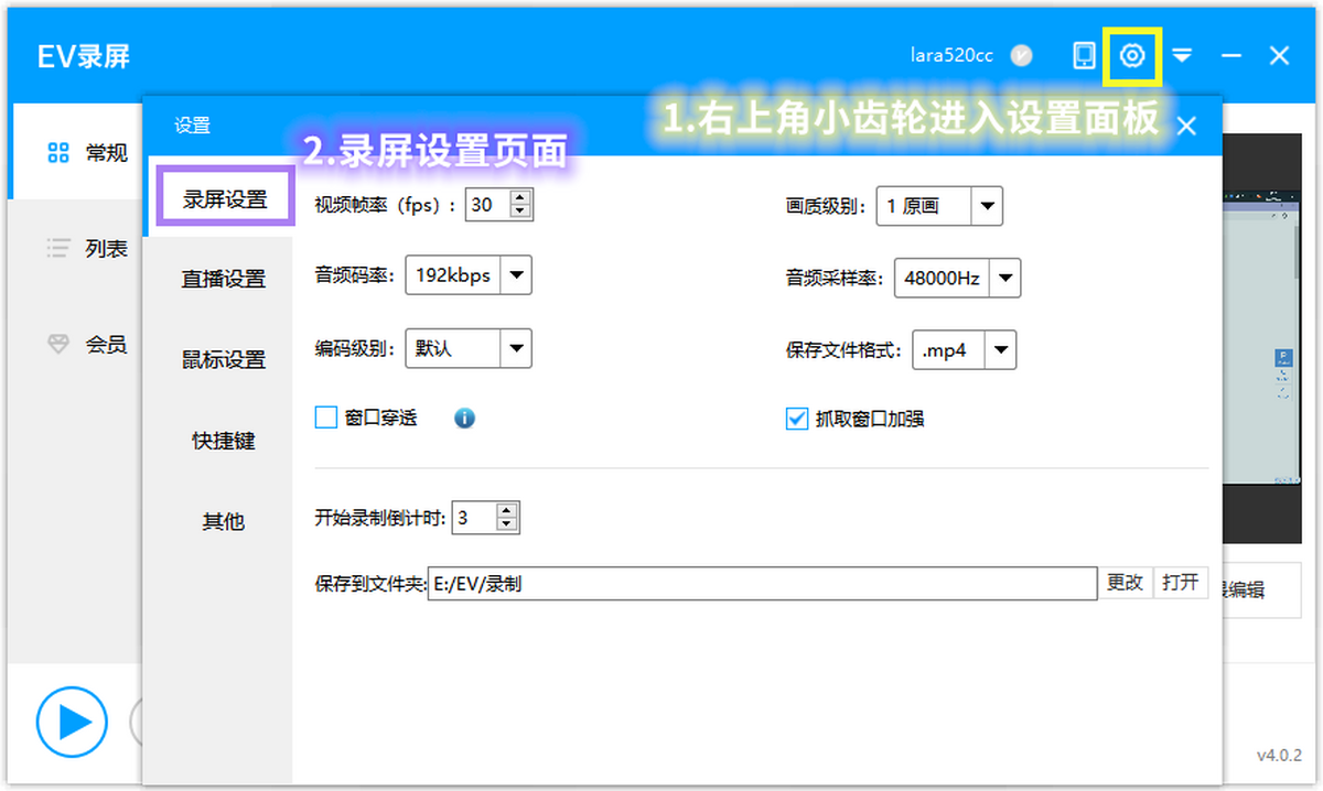 【ev录屏-主界面】选择录制模式,录制区域与音频,以及录制过程中常用辅助功能。