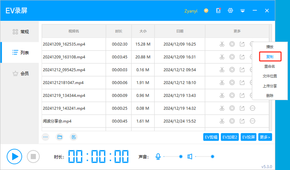 在录好的界面中点击列表栏中的【更多】按钮,点击【复制】,如下图所示,可以直接ctrl+c粘贴到其他位置,如微信对话框;