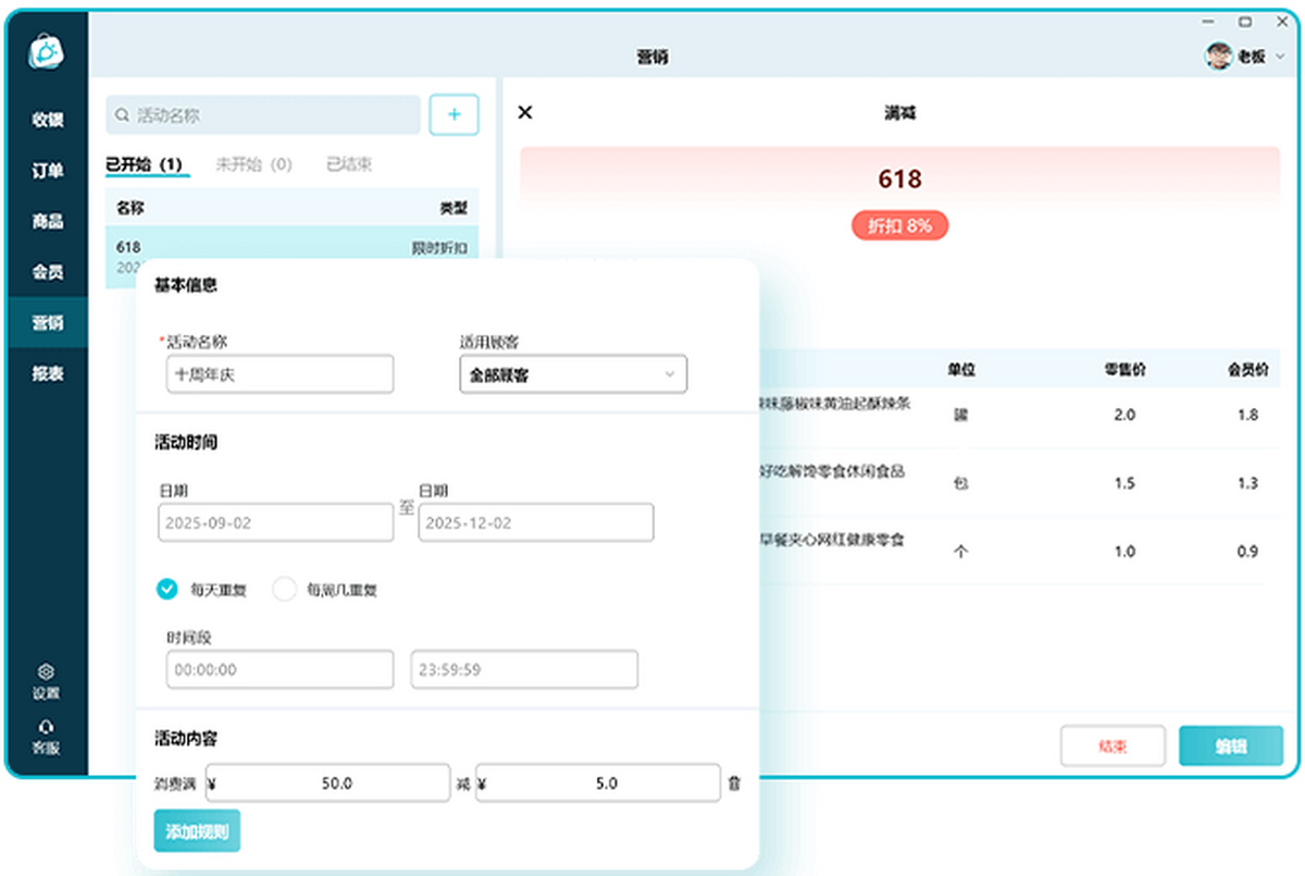 优惠结账、挂单收银、价签打印、吊牌打印、小票打印、库存管理、商品规格、单位管理、员工权限、交接班报表