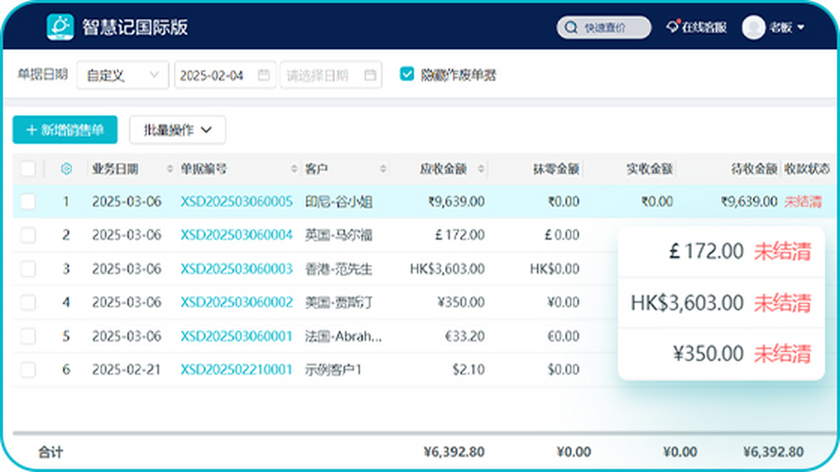 智慧记国际版(ailit)专注解决外贸企业英文进销存管理需求!提供简体中文、繁体中文、英文、西班牙语、葡萄牙语、阿拉伯语、泰语操作界面,无缝切换美元/欧元等多币种结算,自动计算当地税费与实时汇率。10几年服务300万商户,为跨境外贸企业、海外华人华商提供专业级英文版进销存系统,助力高效管理全球订单、库存及财务结算!